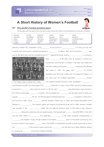 Weltweit gilt der Frauenfußball heute als eine der am rasantesten wachsenden Sportarten überhaupt - obwohl er in der öffentlichen Wahrnehmung und den Medien immer noch weit hinter dem Männerfußball zurücksteht. Dabei waren Fußballspiele zwischen Frauenteams im England des frühen 20. Jhd. bereits äußerst populär und lockten schon damals zehntausende Zuschauer in die Stadien, ehe Frauen dann 1921 die Ausübung des Sports vom englischen Fußballverband verboten und erst 1970 wieder gestattet wurde. Vor dem Hintergrund der Fußball-EM der Frauen in der Schweiz vom 02. - 27. Juli 2025 vermittelt das Arbeitsblatt für das Fach Englisch ab Klasse 7 anhand eines Lückentextes und zehn "Basic Questions" relevantes Basiswissen zur Entwicklung und Geschichte des Frauenfußballs. Ergänzt wird das Unterrichtsmaterial durch einen umfassenden Lösungsteil zur Selbstkontrolle.