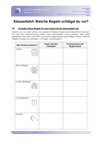 Das Arbeitsblatt für das Fach Gemeinschaftskunde ist geeignet zum Einsatz in der Mittelstufe und dient der Reflexion von Regeln als Vorbereitung auf eine anstehende Klassenfahrt. Die Schülerinnen und Schüler sollen sich vor Antritt der Fahrt in die Rolle der Lehrkraft versetzen und für zehn verschiedene Anlässe und Orte mögliche Szenarien überlegen, die zu Konflikten oder Ärger führen könnten. Für jedes Szenario gilt es anschließend eine Regel aufzustellen, die auf diese Situation angewandt werden kann. Für den Fall, das gegen diese Regel verstoßen wird, sollen die Schülerinnen und Schüler gleichzeitig auch noch mögliche Konsequenzen erarbeiten.